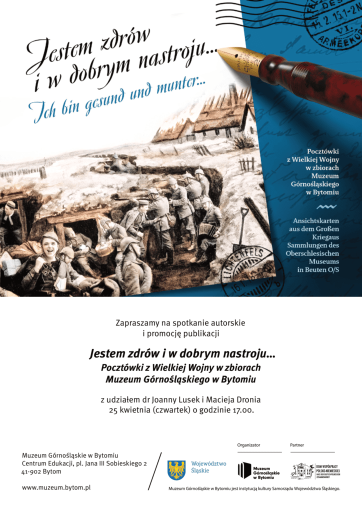 Wszystkich zainteresowanych zapraszamy na spotkanie autorskie i promocję publikacji „Pocztówki z Wielkiej Wojny w zbiorach Muzeum Górnośląskiego w Bytomiu” w Muzeum Górnośląskim w Bytomiu, Centrum Edukacji, pl. Jana III Sobieskiego 2, 41-902 Bytom.