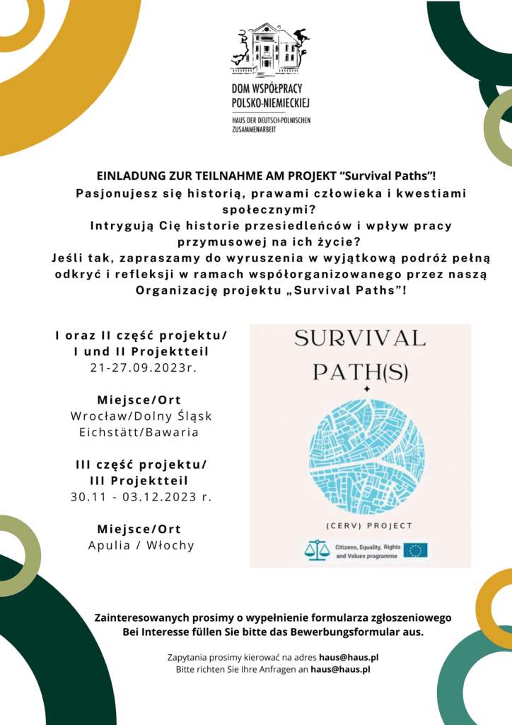 Pasjonujesz się historią, prawami człowieka i kwestiami społecznymi? Intrygują Cię historie przesiedleńców i wpływ pracy przymusowej na ich życie? Jeśli tak, zapraszamy do wyruszenia w wyjątkową podróż pełną odkryć i refleksji w ramach współorganizowanego przez naszą Organizację projektu „Survival Paths”!